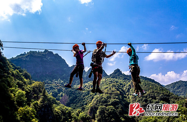 在整个运动中,汇集了高空、速度、力量、毅力等户外探险所必备的元素,目前有成人线和儿童线二条线路供游客选择,4到60岁的游客都能根据自己的身体状态找到适合自己的线路,在这里能让您感受不一样的户外极限。