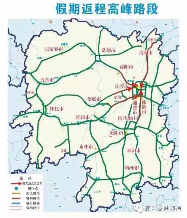 怀化、娄底地区可以选择娄怀高速、长韶娄高速出行,邵阳地区可以选择二广高速北上在2097公里的涟源互通转长韶娄高速出行,避开沪昆高速湘潭段的车流高峰。