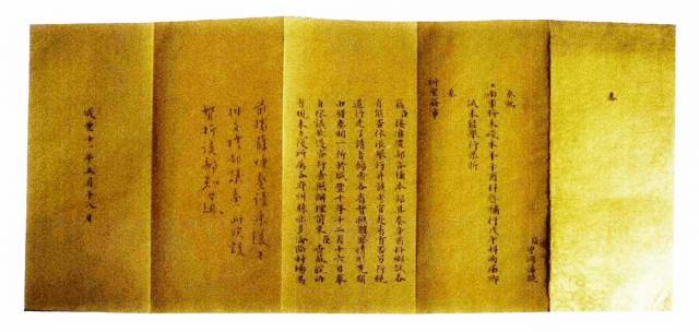 将奏折送出衙门外,有个专有名词叫做“拜折”。拜折时得举行隆重的仪式。这天一早,衙门警卫森严,卫兵严执刀枪站在甬道两边,僚属们则按品级列排于庭院中。大堂上设香案,将一个尺馀见方的木箱供放在香案上,木箱由黄缎包着。