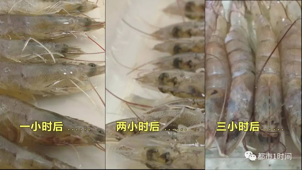 记者随后在长沙多家不同市场上购买了一些鲜虾。记者观察注意到,这些新鲜的活虾,虾头色泽清透,微微泛着光亮,随后,记者将这些虾子清洗后放置观察,一个小时后,虾头颜色并无明显变化。而在两个小时后,情况有了变化,部分虾头已经变黑;三个小时后,大部分虾头都变成了黑色。