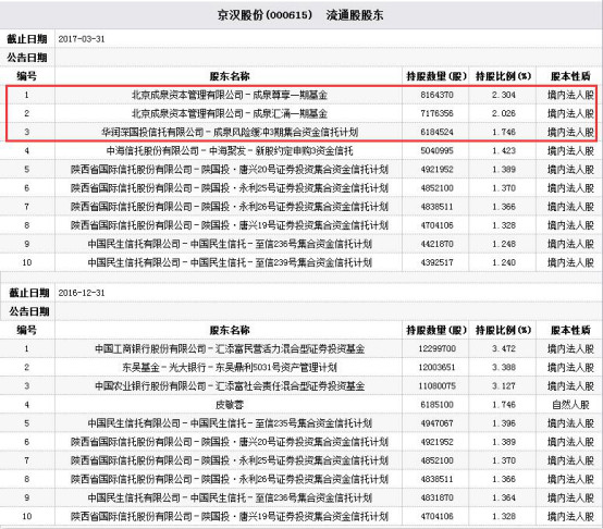 2016年,仅有成泉风险缓冲3期集合资金信托计划出现在次新股东方中科的前10大股东名单,持股数仅为29.2万股,市值不过几百万。但蹊跷的是,成泉资本2017风格突然大变,于2017年第一季度大举买入京汉股份,并一举包揽前三大流动股东席位。