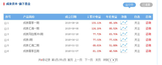 私募排排网的数据显示,成泉尊享一期累计收益最高达133.11%,年化收益率达66.16%。最低的成泉尊享五期累计收益达61.23%,年化收益率达46.54%。