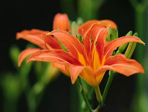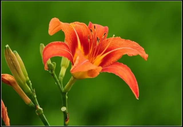 萱草属多年生宿根草本,其叶形为扁平状的长线型,于开花期会长出细长绿色的开花枝,花色橙黄、花柄很长、呈为像百合花一样的筒状。