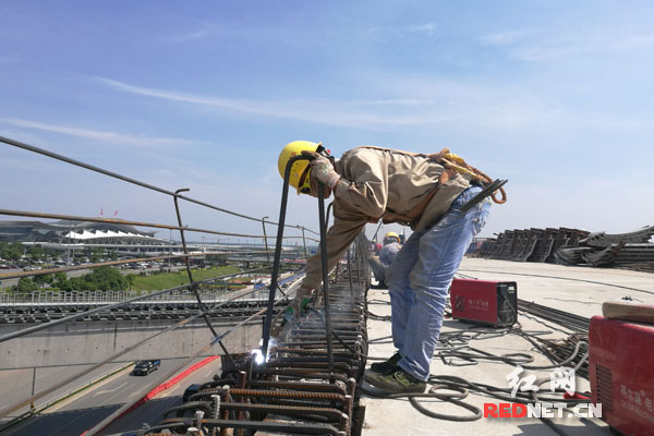 其中,长沙机场大道提质改造工程就是临空经济示范区一大重点联通项目。机场大道呈南北走向,起点位于长永高速黄花收费站,与机场T1、T2航站楼匝道相连,终点接机场联络线南延线起点,全长4.763公里。其建成后将实现与公交、地铁、磁浮、高速等交通方式的“无缝对接”。这是国内首次上跨磁浮桥采用钢箱梁顶推及高位落梁工艺,跨磁悬浮钢箱梁总长90米,主跨39.15米,梁面宽18米,与磁浮桥外斜交45度,磁浮列车与大道车辆交叉同行。目前,整个机场大道主道建设已进入尾声,大道两侧墙体加防加固工作正在进行中,预计今年6月30日全线通车。