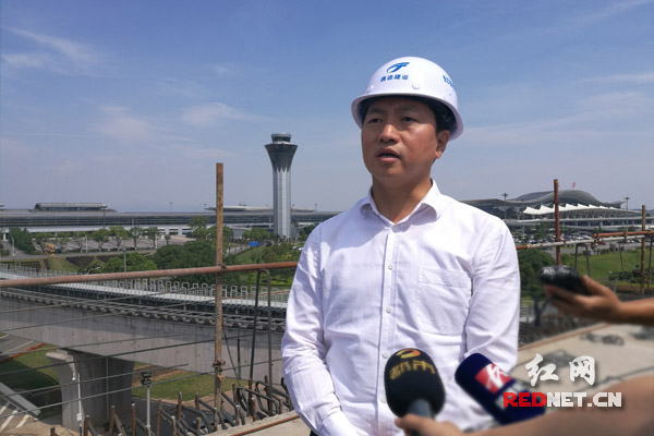 长沙县委书记曾超群在机场大道施工现场接受采访。
