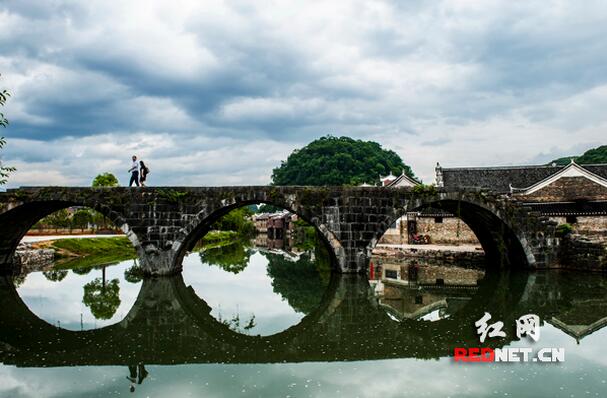 游人从村里的步瀛桥上走过。