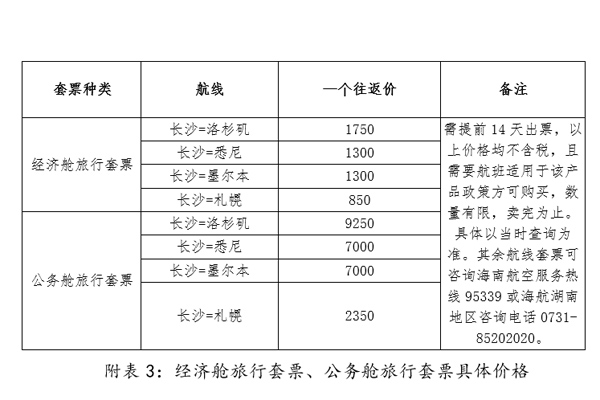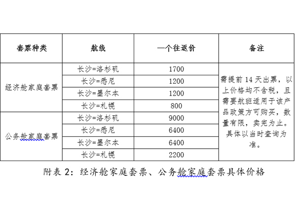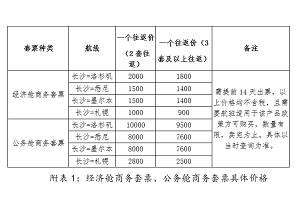 购买商务套票的往返次数越多,单次往返的价格就越便宜。例如长沙=洛杉矶航线购买经济舱商务套票2套往返时,一个往返价为2000元(不含税),经济舱商务套票购买3套及以上往返时,一个往返价为1800元(不含税)。公务舱商务套票购买2套往返时,一个往返价为10000元(不含税),公务舱商务套票购买3套及以上往返时,一个往返价为9500元(不含税)。