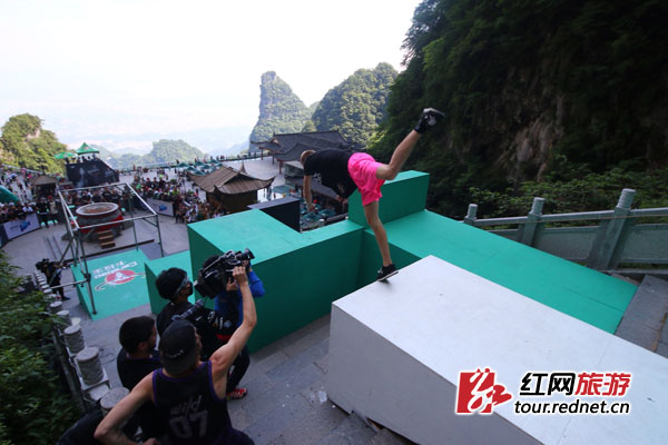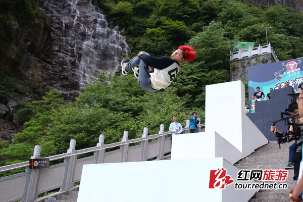 29日,天门山“移步登天”卡拉宝世界跑酷大赛技巧赛决赛在天门洞景点举行,这也是本次大赛的最后一个项目。