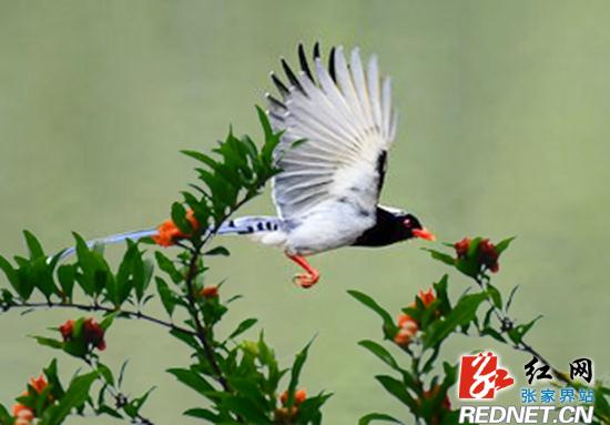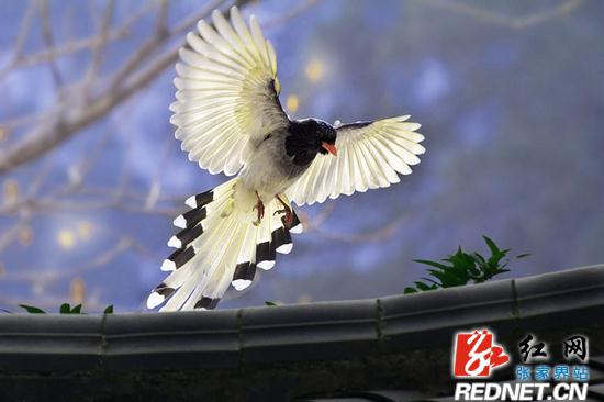 红网张家界分站6月1日讯(通讯员 李远明)“快看,快看,哪是什么鸟?好漂亮!”六月一日早上,张家界黄龙洞景区生态广场,几只拖着长长的尾巴在林间穿飞的红嘴蓝鹊吸引了众多游客的关注,人们为它们明艳夺目的羽毛和矫健优美的身姿赞叹不已。资料显示,红嘴蓝鹊是一种比较罕见的珍稀鸟类,属于国家二类保护动物。