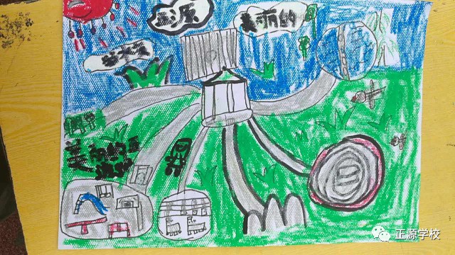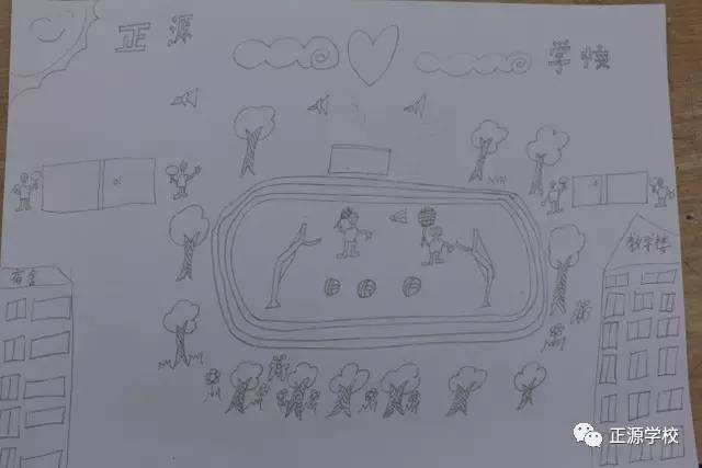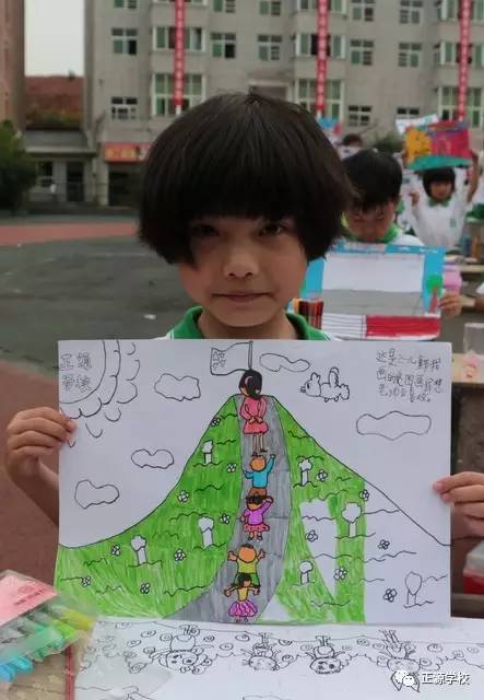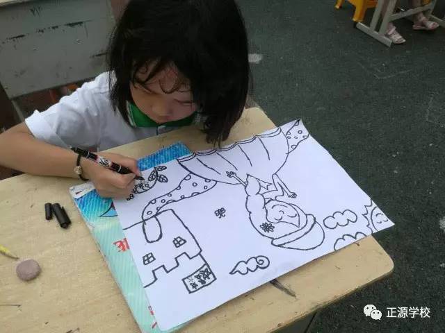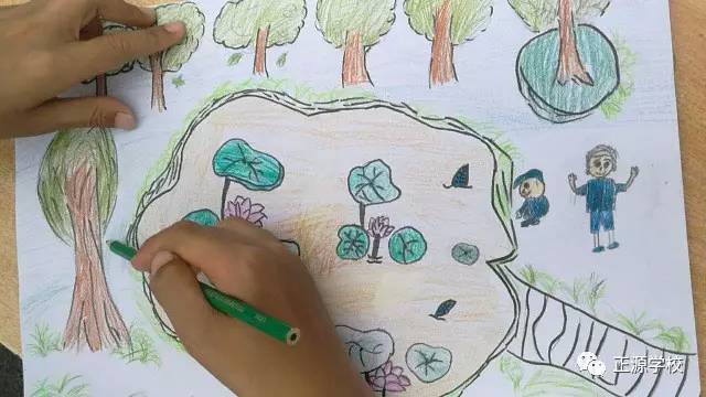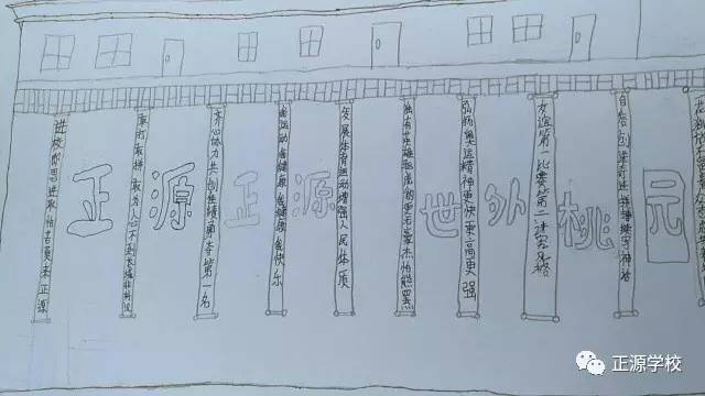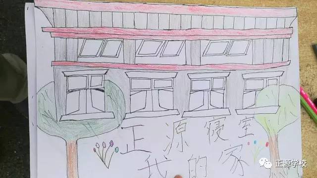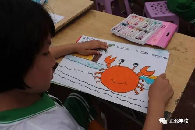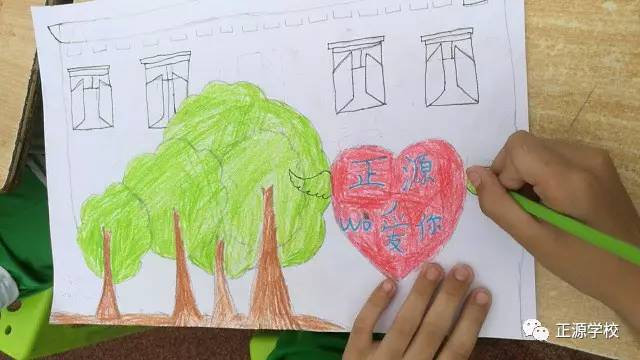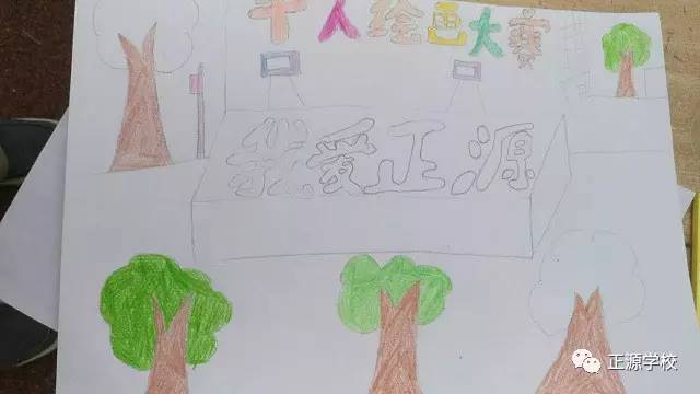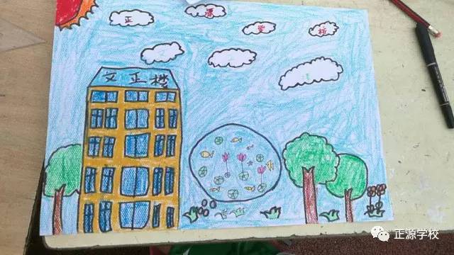 笔者在巡视的过程中,不时为同学们丰富的想象、巧妙的构思、精工的用笔、协调的着色所吸引,所惊叹。六年级254班贺思捷同学画的是学校的荷花池塘,画面上题着:接天莲叶无穷碧,映日荷花别样红。还写着:老师就像无私奉献的荷花,培育了许多美丽的小荷花,望以此画感谢老师。三年级221班龙冰雪画的也是《美丽的池塘》,池塘里小蝌蚪摆动尾巴自由游动着,或群游,或单枪匹马。小鱼则在玩“O”字造型,仿佛有鱼在导演似的。池塘里的水被微风吹拂,皱起一层层波澜。池塘周围是小树和石板路……学生观察事物是多么细致。一年级313班贺少灵同学画的是《家(校)园》,教学楼左上角是一轮红日,画面上方是蔚蓝的天空点缀着朵朵白云,画面中间有飞舞的蝴蝶和蜻蜓,下面有一束一束的鲜花和小草,两边有小树,好一个温馨的世界。一年级315班周丹桦同学,在画面上写着:正源学校bangzhu我学习,peiban我成长,我爱正源学校。小小年纪,连汉字都写不全,就懂得感恩,可见正源学校对孩子们的影响有多么深刻。
