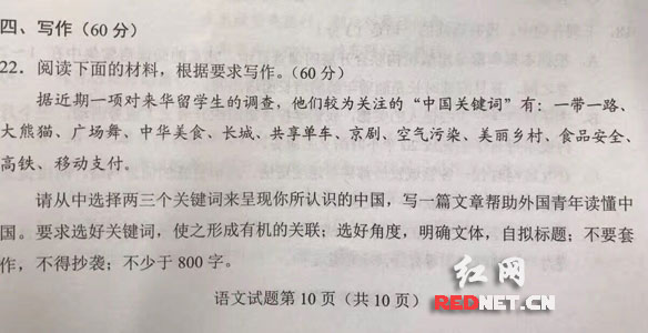 2017全国高考大幕开启,首门语文考试于今天上午11点30分结束。今年湖南使用的是全国卷1,语文考试的作文题要求学生在12个热点词汇中,选择两三个关键词,来呈现眼中的中国,写一篇文章帮助外国青年读懂中国。