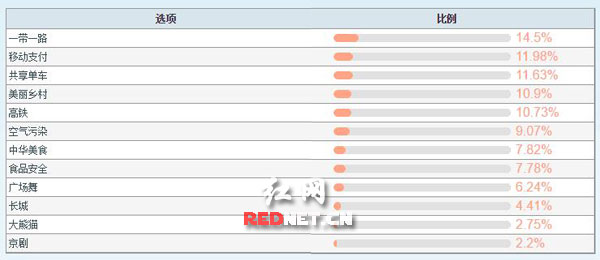 12个热点词汇分别是:一带一路、大熊猫、广场舞、中华美食、长城、共享单车、京剧、空气污染、美丽乡村、食品安全、高铁、移动支付。