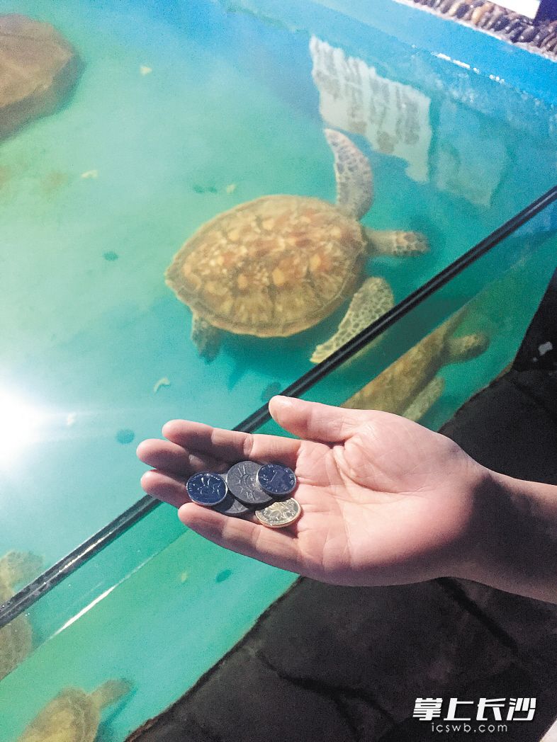 记者看到,龟池边贴着一则提示标语:“禁止游客自带食物”。周惠说,海龟是杂食性动物,他们给海龟喂鱿鱼、黄鱼、海白菜等食物,都是新鲜、干净、消过毒的。私带的食物不卫生,海龟吃了容易生病,更别说钱币了。“个别游客还把塑料袋、槟榔渣往里面丢。”