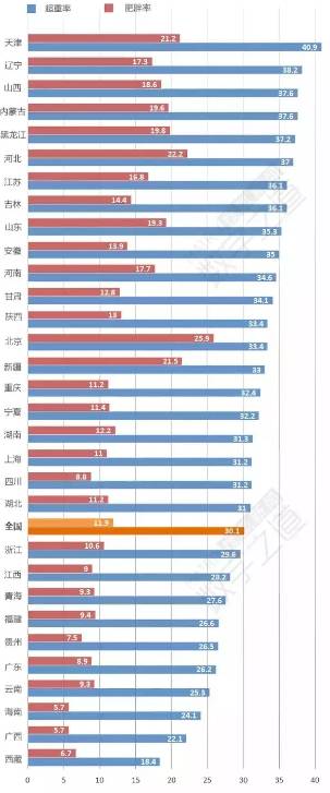 北方地区肥胖率明显高于南方,北京更是比全国平均值还高了7名位列肥胖率第14名!