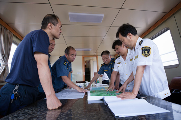 钱俊君(图右一)乘坐“湘海巡05001”调研湘江航道,并与衡阳市地方海事局、衡阳航道管理局就湘江三期航道建设、码头、渡口建设等对照设计草图进行研究。