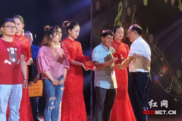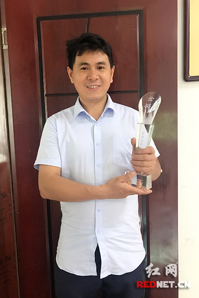卢义方作词的《家乡有棵树》获湖南省“新人新歌”大赛创作金奖,他正在领奖。