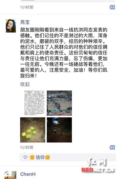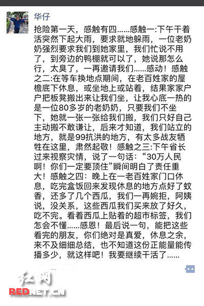 两天的抢险经历让徐伟华感触不已,细腻的他将搬小板凳的老奶奶,生气大家在鸭舍里躲雨的老奶奶,送西瓜的阿姨们写在了微信朋友圈,写下“感动,肃然起敬,责任重大,感恩”四个感触。