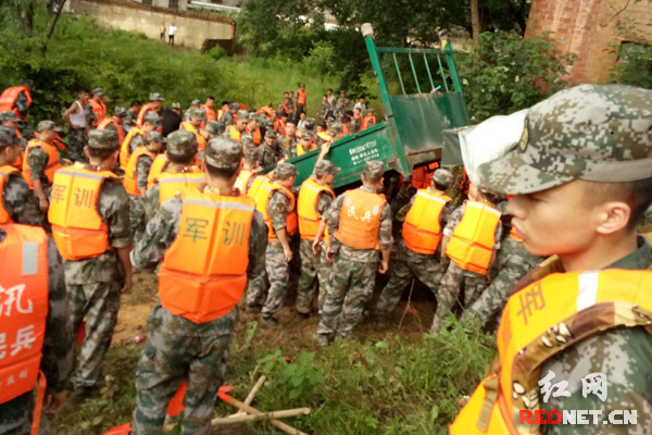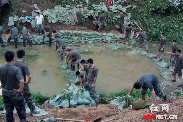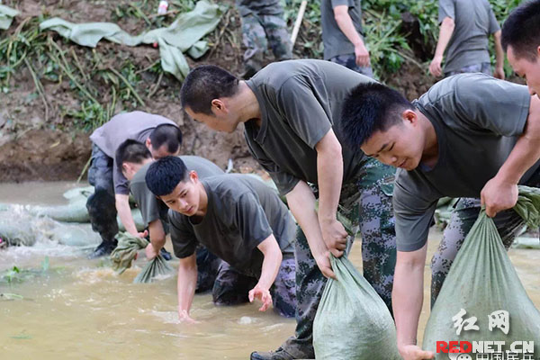 湖南省军区直属队110名官兵在益阳市资阳区民主垸沙头镇堤段抗洪抢险。