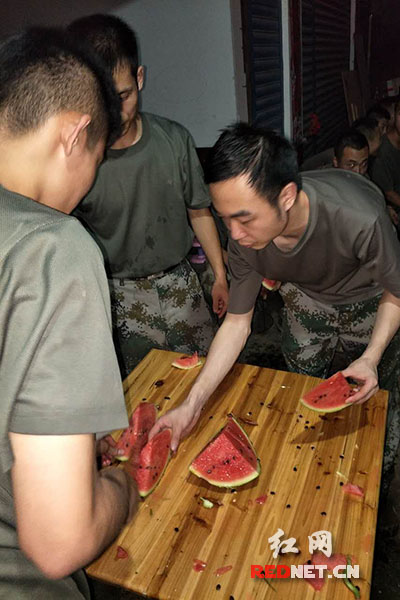 暴雨没有停歇,抗洪仍在继续,村民们的关心也在继续。徐伟华和战士们临时休息的地方经常点好了蚊香,多出西瓜和热茶。一再婉拒,村民们便切好西瓜,一个个送到手边,直到看着战士们吃完才离开。