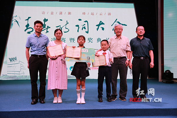 红网名誉董事长、湖南省政府文史研究馆馆员、湖南师范大学历史文化学院教授郑佳明(右二),湖南红网新媒体集团党委副书记、总编辑贺弘联(左一),长沙市文明办副主任梁飞彩(右一),为冠军卿熙容、亚军李毓哲和季军周湘颁奖。