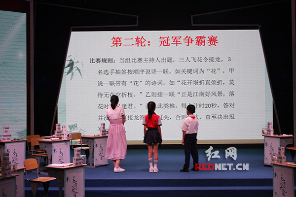 “请说出带有‘月’字的一联诗句。”冠军争霸赛的“飞花令”环节上,主持人刚说出题目,三位小选手就自信笃定地轮流说出诗句,经过了14轮的pk为观众们带来了40余句经典诗词。评委老师刘兵现场出题,第二轮飞花令的关键字为“花”,卿熙容和李毓哲一轮接着一轮,他们诗词的储备量、现场机智地反应、临危不乱的台风,让台上台下所有评委、裁判与观众都叹为观止,场上响起了久久不息的掌声,无不为“小才子”和“小才女”赞叹不已。