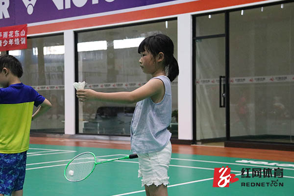 在雨花东山全民健身中心的羽毛球馆,7岁的李钰清正十分专注地跟着教练一个一个分解动作地练习发球。据李钰清爸爸李国勇介绍,今天(8月3日)是李钰清参加培训的第4天,一举一动都已经小有架势,而且李钰清也因为这次培训对羽毛球产生了浓厚的兴趣,在为期十天的培训结束后,也会继续学习羽毛球。