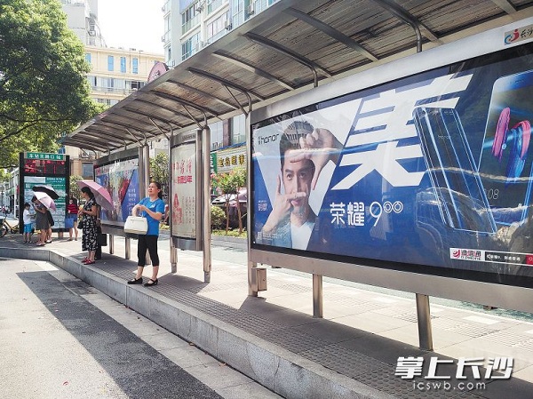 车站北路口站,市民正在烈日下站等公交。长沙晚报记者 邓艳红 摄