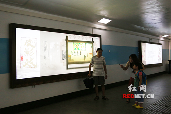 长沙市韶山中路雨花亭南端的地下通道,皮影戏文化墙吸引小朋友驻足观看。