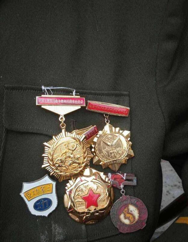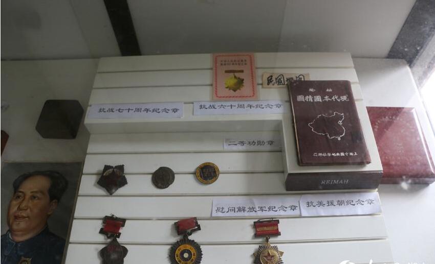 抗战七十周年纪念章、抗战六十周年纪念章、二等功勋章、抗美援朝纪念章等荣誉勋章,战场上缴获的刺刀,纪念抗战胜利70周年照片墙,教育读本。上百件展品,12个展柜,不到百平米的展馆,显得很充实。