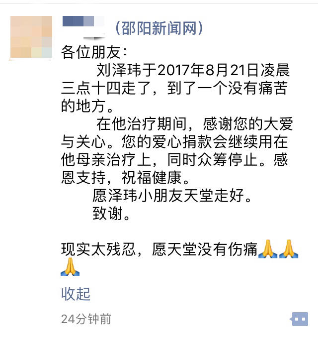 目前,刘泽玮父亲停止了众筹,已筹集款项将用于刘泽玮妈妈的抢救及后期治疗。