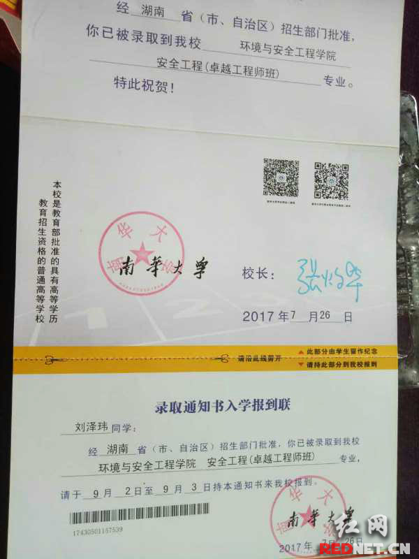 刘泽玮被南华大学环境与安全工程学院录取,成为准大学生。
