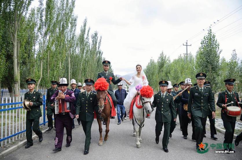 在婚礼现场,阿依夏动情地向笔者介绍说:“在这十年的时间里,我们写过200多封信,打了无数次电话,见面的机会特别少,在一起的时间也不超过半年,但我们相互支持,相互鼓励,爱情的热度并没有减少。”图为迎亲队伍敲锣打鼓迎新娘。杜麒麟 刘慎 摄影报道 图片来源:中国军网