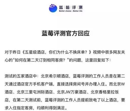 随着舆情的持续发酵,不少业界人士和网民开始对蓝莓的评测提出质疑和商榷之声。在对酒店表示不满的同时,不少网友开始质疑测评机构称,发布的视频只完整记录了一家酒店的评测过程,其他酒店都只放出了评测结果,让人不免心生怀疑。