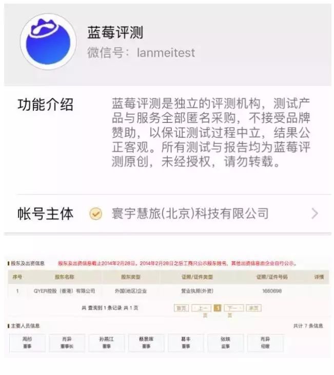 更有网民扒出“蓝莓评测”机构隶属于寰宇慧旅(北京)科技有限公司。根据国家企业信用信息公示系统,该公司成立于2012年04月17日,法人为肖异,大股东为QYER控股(香港)有限公司,肖异也是穷游网(QYER)的创始人。
