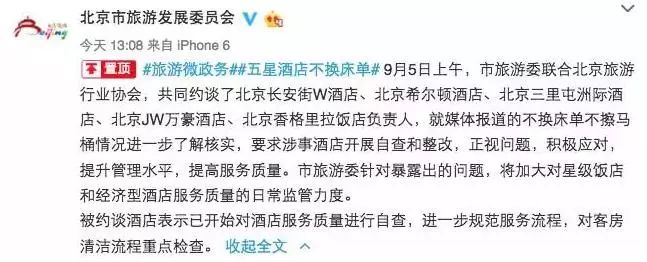 9月5日下午13:08分,北京市旅游发展委员会发布微博称,已经约谈了报道中涉及的五家酒店,并核实相关情况。如果情况属实,将责令其整改。随后,北京市卫生和计划生育监督所表示,卫监部门已对此事展开调查,本周内将检查北京所有五星级酒店,如发现违法行为,将严肃查出。