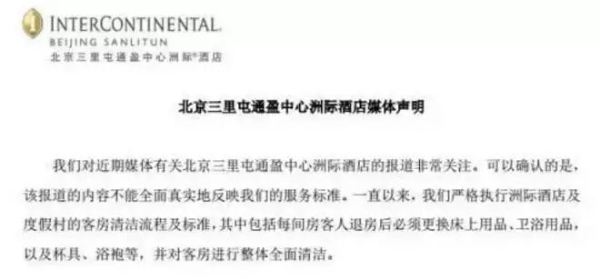 与前段时间海底捞事件不同,在网上舆论闹得热火朝天的时候,涉事酒店基本无回应。从事发的9月4日到9月5日白天,没有一家涉事酒店通过公开的官方渠道发布声明,着实让人大跌眼镜。直至9月5日晚间,北京三里屯洲际酒店刊发声明。其它四家依然没有官方声明,只是陆续在接受采访进行解释或者回应。