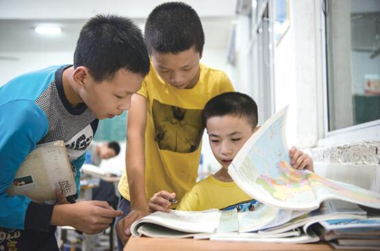 喻壮(右一)在给同学辅导功课。资料图片