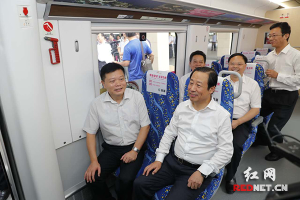 湖南省委副书记、省长许达哲(前排右)等领导一同在动车上进行了体验。