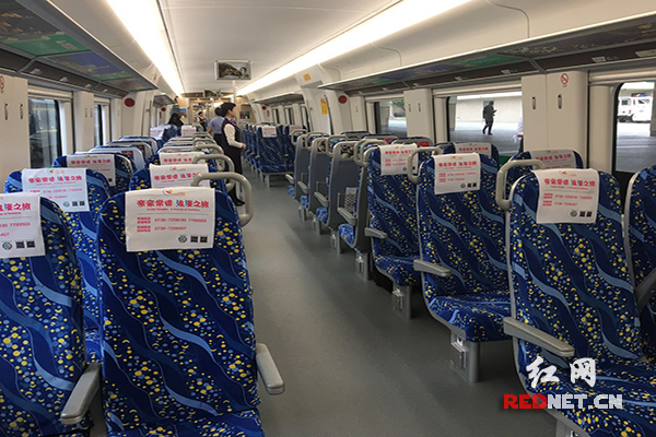 石长铁路线开行的动车组采用CRH6F型动车组,除头车外每节车厢都有三对双开塞拉门,方便旅客乘降。动车组在01车、03车、06车、08车分别设置1个洗手间,方便旅客在旅途中使用。同时,为解决旅客饮水问题,动车组还将在01车、04车、08车加装饮水机,进一步完善服务设施。动车组每排座椅靠走廊侧都预留有电源插座,方便旅客在途中为手机、笔记本、平板电脑等常用设备充电,提升乘坐品质。