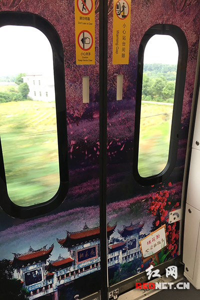 车内每扇窗户底部与座椅背后都贴有常德、石门的特色美食与美景,常德米粉、钵子菜、擂茶、石门肥肠让人口水直流,桃花源、城头山、夹山寺的风景又让人感受到满满亲切感。