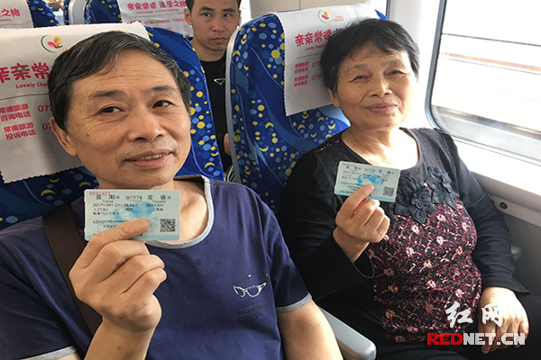 坐第一列动车回常德的王开觉、王开杰姐弟拿着手上的车票,为动车点赞。