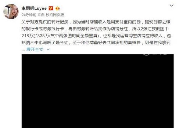 李雨桐表示薛之谦晒得2张汇款截图中218万加333万(其中两张图时间金额重复),也都是她运营淘宝店铺应得收入,包括图片中也写明了是分红。而对于买车,她则称是公司所有:“当时我们用淘宝共同的收入购入一辆浅蓝色马自达小型商务车作为工厂运面料使用,另一辆是墨绿色MINI 标配版作为设计部门采购用,两辆车的价格均为16万左右,价值等同。马自达的车主是薛的父亲,MINI的车主是我,所以完全不存在私人买车送我这一说。”