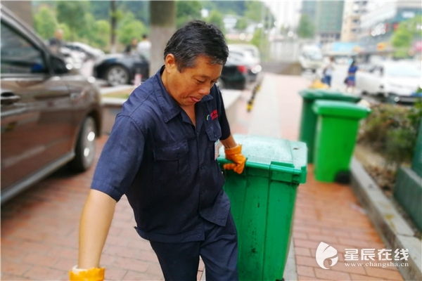 和缪稳柱一起的,还有庄莫勋师傅,他主要负责拖运垃圾桶,两个人分工合作,密切配合,一个小门面的垃圾清运,不到1分钟就搞定。