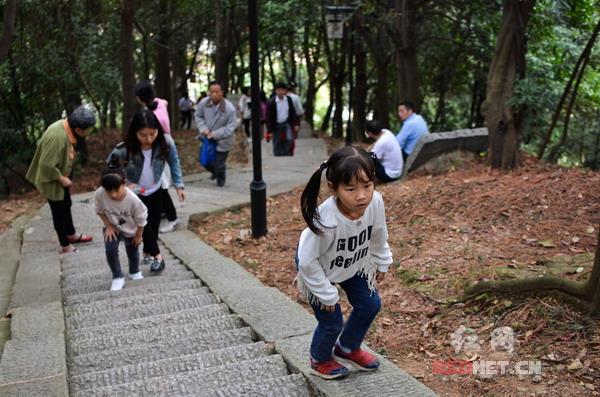 登山古道上,一位小朋友和身后的游客正奋力攀登。