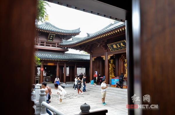 修缮一新的昭山古寺门前游客正在拍照留念,观赏风景。