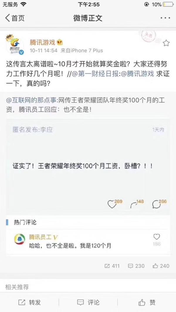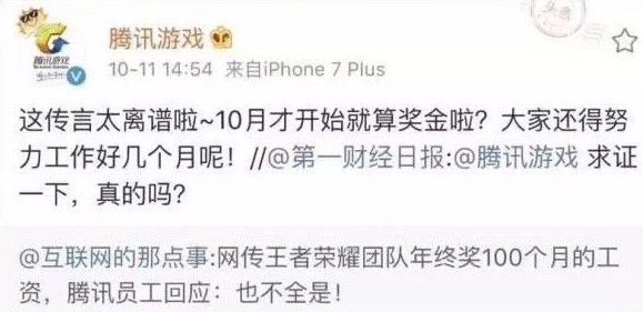 10月11日下午,腾讯游戏的微博官方账号辟谣称:“这传言太离谱啦~10月才开始就算奖金啦?大家还得努力工作好几个月呢!”