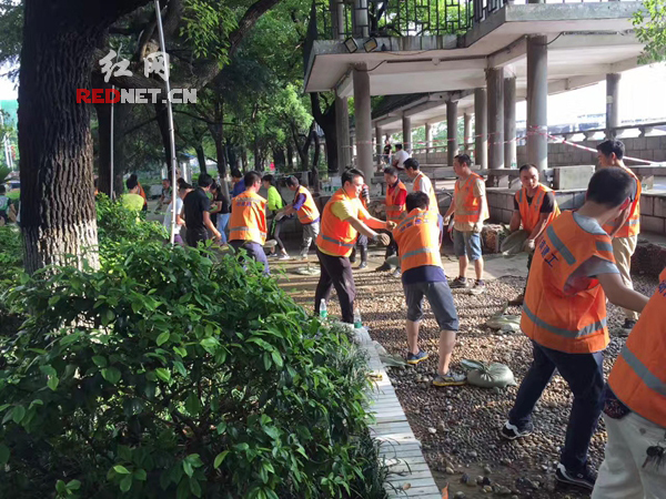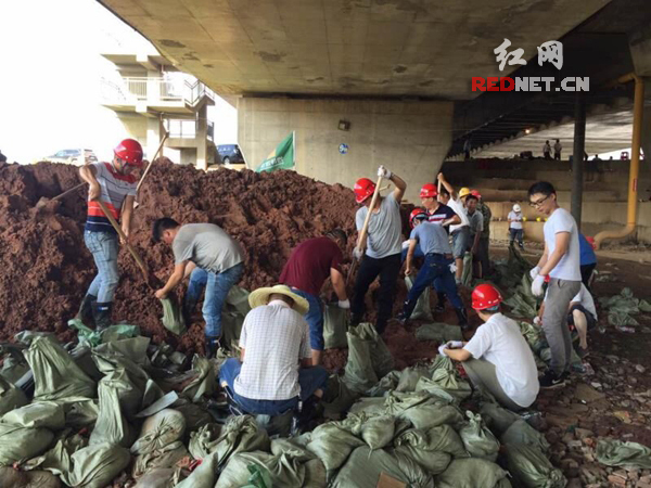 湖南建工集团六公司工作人员在湘江一桥传递沙袋。