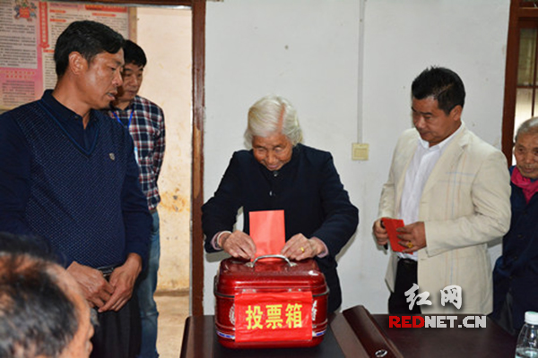 衡阳市祁东县白地市镇党代表选举大会上,该村年纪最大(83岁)的党员投上自己神圣的一票。