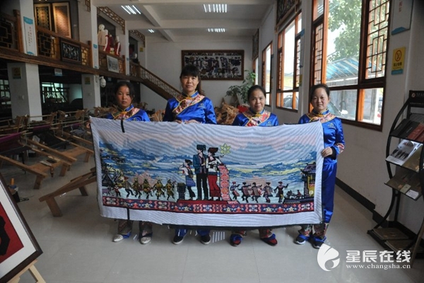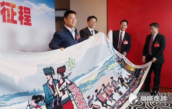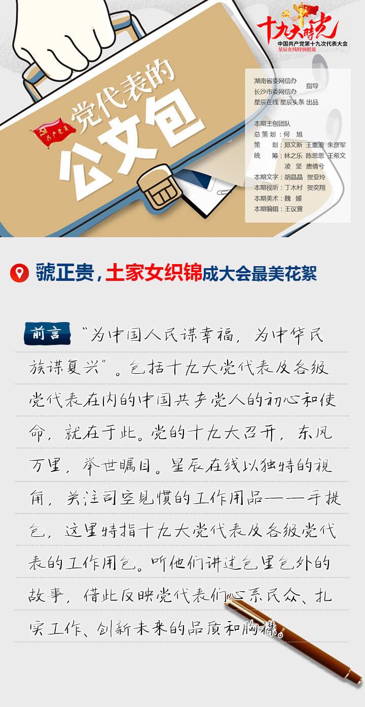 果然就有一则花絮,被他写进备忘。虢正贵介绍,这次来还带了一件名为《武陵小康》的土家织锦。这是100名土家织女花了5个多月时间,挑织了132712个色块,一针一线精心编织了这件长4.65米、宽1.6米的织锦作品。绣好后,织女们让他带到北京,作为张家界人民献给党的十九大的一份礼物。“党的十八大以来,武陵山片区被纳入精准脱贫重点区域,人民生活发生了翻天覆地的变化,土家族妇女通过织锦技艺培训,掌握了脱贫技能,过上了更好的生活,武陵源区也成为湖南省首批整区脱贫摘帽的区县之一。”虢正贵认为,这说明张家界人民始终感恩于党的好政策,他们希望通过自己的努力,把家园建设得更加美好。