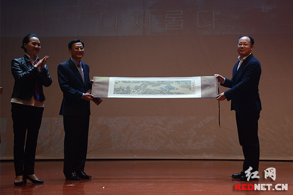 湖南省演艺集团总经理胡俊(右一)代表湖南省文化交流艺术团向韩国论山市赠送纪念品。左二为论山市副市长洪成穆,左一为湖南省歌舞剧院院长杨霞。